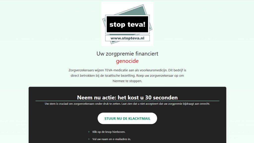 Door het preferentiebeleid hebben veel apothekers geen keuze bij het aanreiken van medicatie. Als Teva een voorkeursmiddel is voor de medicijnen die je gebruikt, moeten ze vaak toch Teva aanreiken. Voor een alternatief betalen zij zelf, of de patiënt. Wij vinden niet dat dit hoort. Als patiënt is het je recht om zelf te bepalen waar je zorgpremie naartoe gaat, zonder hiervoor nóg meer te moeten betalen. Daarom voeren we actie om de zorgverzekeraar de verantwoordelijkheid te laten nemen voor een genocidevrij inkoopbeleid. We werken samen met stopfundinggenocide.nl om via honderden, duizenden mails, een signaal af te geven aan de zorgverzekeraar.